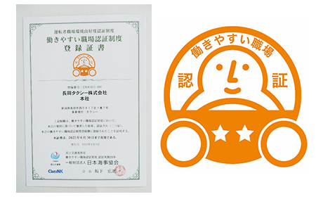 2023年6月1日付で、国土交通省指定 一般社団法人日本海事協会の運転者職場環境良好度認証制度 働きやすい職場認証制度において『二つ星』を認証されました。