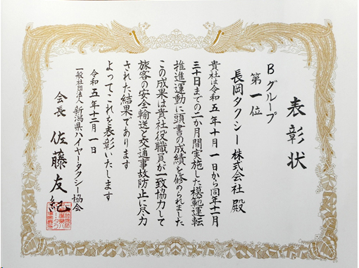2024/01/30 お知らせ 新潟県ハイヤー・タクシー協会から模範運転推進運動で、Bグループ第1位を表彰していただきました。 Tweet シェアする これからも安全運転を第一に、皆様のお役に立てるよう精進して参ります。